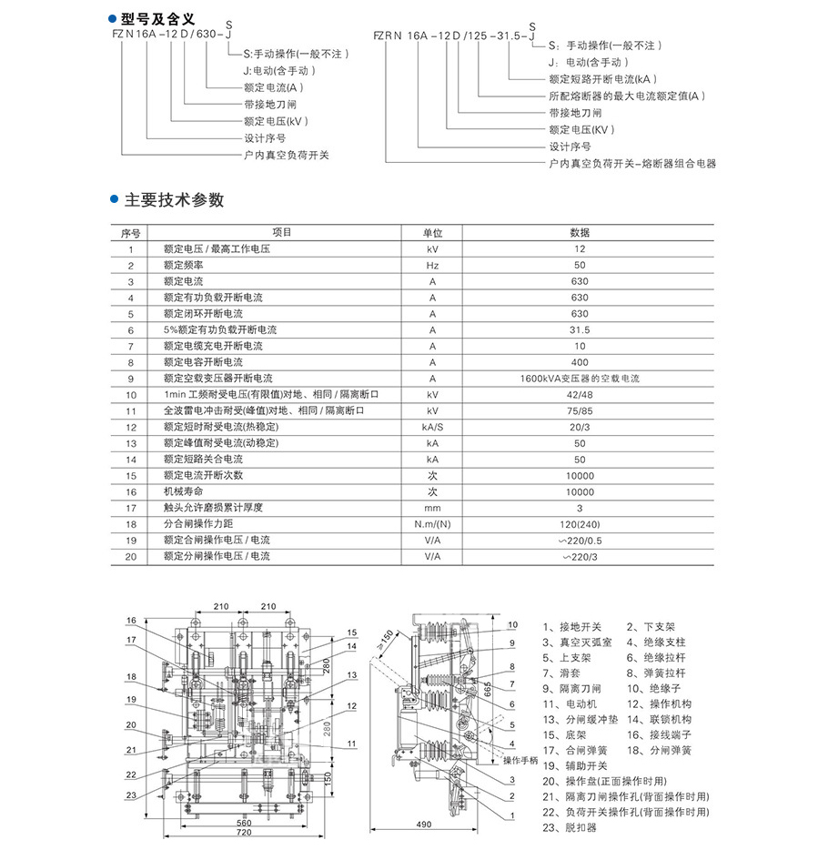 FZN16A- 12D/630型負(fù)荷開關(guān)和FZN16A- 12RD/200- 31.5型組合電器適用于交流50Hz,額定電壓6~ 10kV的網(wǎng)絡(luò)中。FZN16A- 12D/630可開斷負(fù)荷電流,FZN16A- 12RD/200-31.5可開斷負(fù)荷電流、過載電流和短路電流,特別適用于無油化、不檢修及頻繁操作要求的場所。本產(chǎn)品可配用CS6 - 1型操作機(jī)構(gòu),也可在開關(guān)上直接操作,不必另附操作機(jī)構(gòu)。選用FZN16A- 12 -J型開關(guān)可同時(shí)實(shí)現(xiàn)電動(dòng)和手動(dòng)操作。