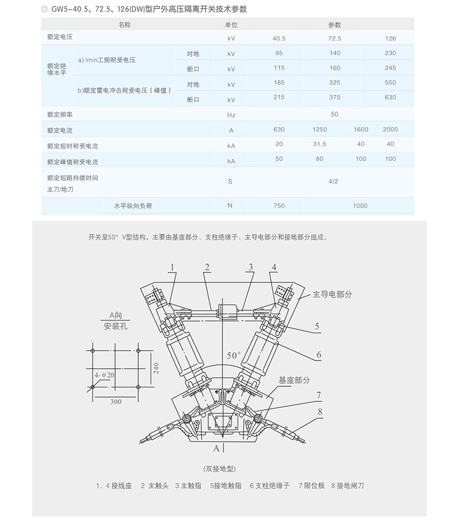 (2)隔離開(kāi)關(guān)屬雙柱V形水平開(kāi)啟式,各單級(jí)都由基座、支柱絕緣子、出線座及觸頭等部分組成,由50°夾角的兩個(gè)支座、兩支柱絕緣子相互夾角地安裝在基座兩端地軸承上,且與基座垂直。主導(dǎo)電部分分別安裝在兩支柱絕緣瓷瓶上方,隨支柱絕緣瓷瓶作約90°轉(zhuǎn)動(dòng)。